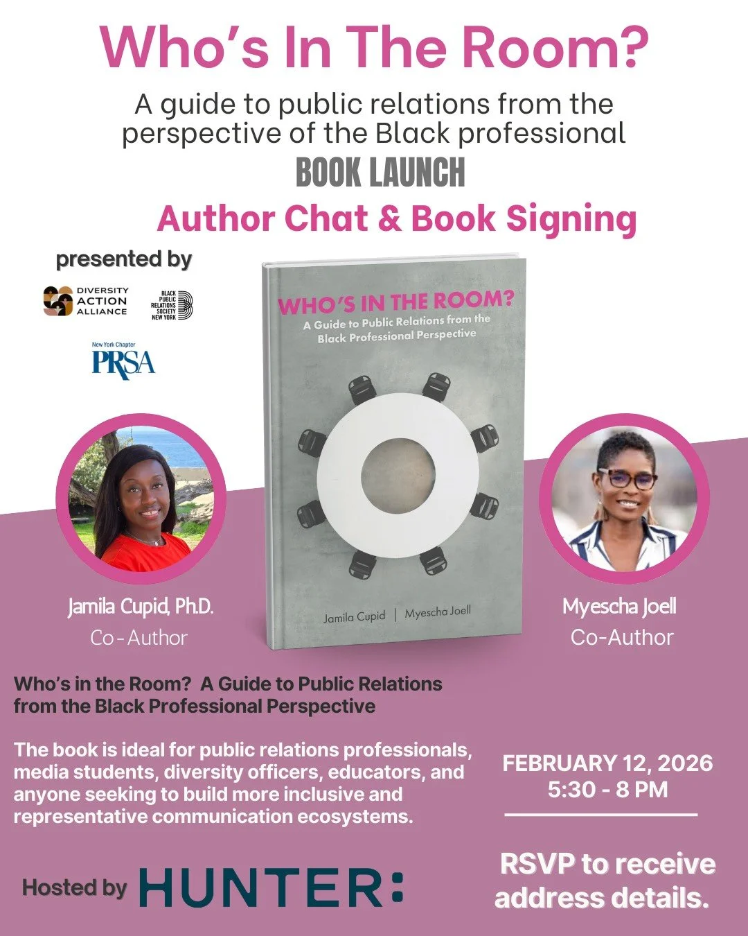 Join us for a special program featuring the newly launched book Who’s in the Room?: A Guide to Public Relations from the Black Professional Perspective by Dr. Jamila Cupid and Myescha Joell.