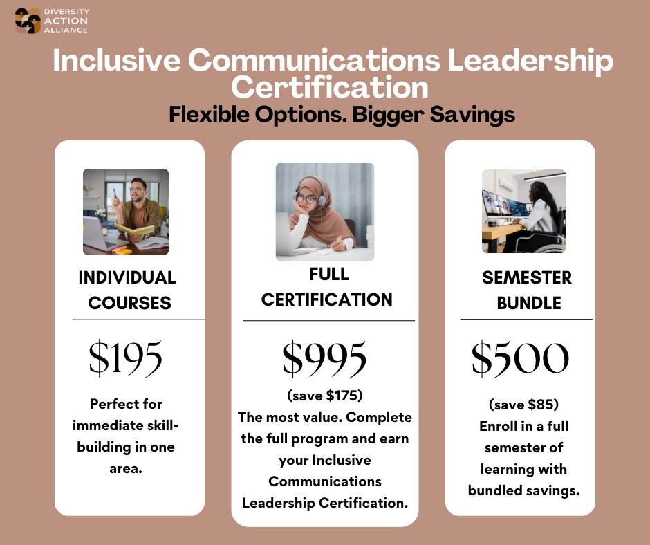 Whether you’re looking to sharpen one skill, dive into a semester of learning, or commit to the full Inclusive Communications Leadership Certification, ICLC offers options that fit your goals, schedule, and budget..